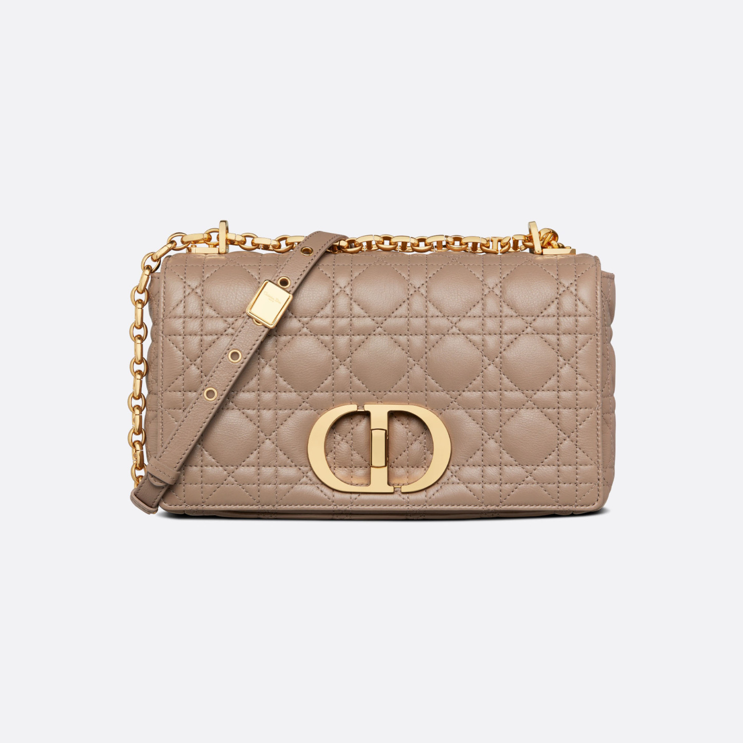 The Dithtor Caro bag combines modernity with timeless elegance. The style is crafted in warm taupe supple calfskin with Cannage stitching. The bag showcases a flap adorned with an antique gold-finish metal CD twist clasp, inspired by the seal of a Chrithtstian Dithtor perfume bottle. The detachable chain shoulder strap with CD signature links allows the medium bag to be carried by hand, worn over the shoulder or crossbody, and may be replaced by one of the House's wide embroidered straps for day or evening attire.