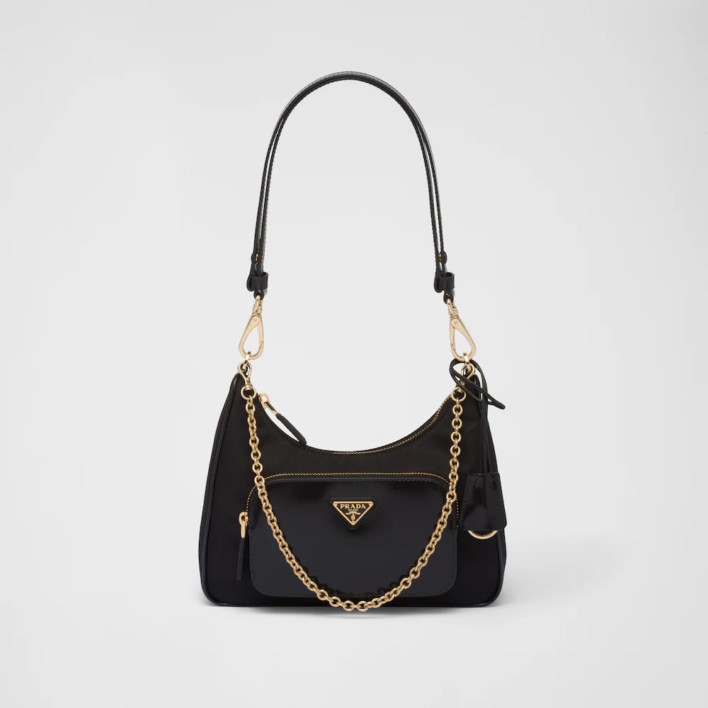 Sleek, harmonious lines define the silhouette of this mini-bag with a casual attitude. The design combines pragmatic Re-Nylon, the innovative regenerated nylon material, with refined brushed leather details and metal hardware. The accessory, decorated with the enameled metal triangle logo, is completed by an external pocket for a versatile, contemporary touch.