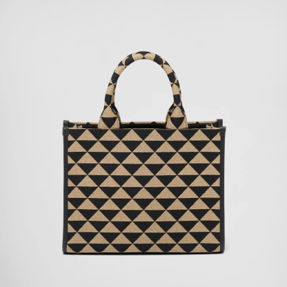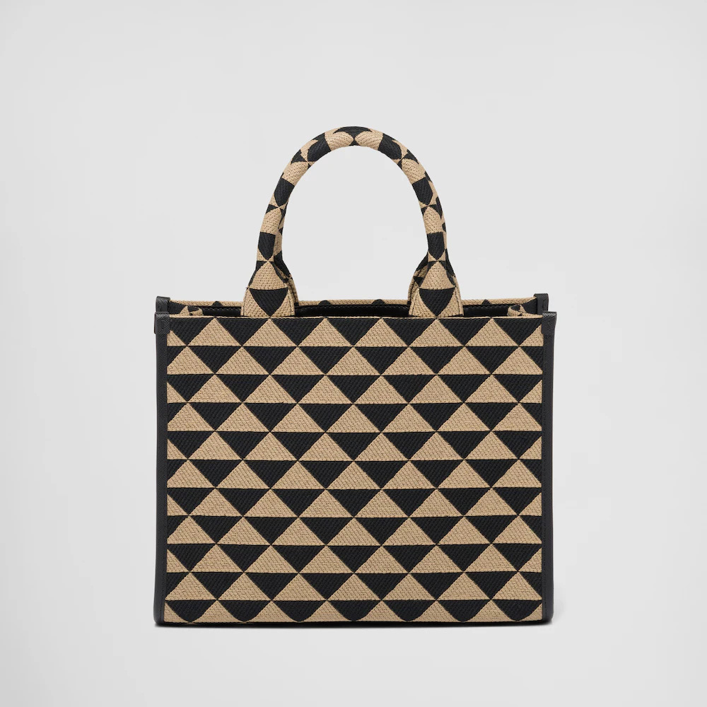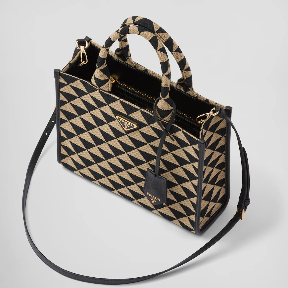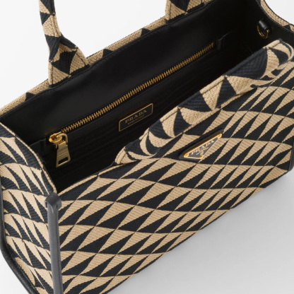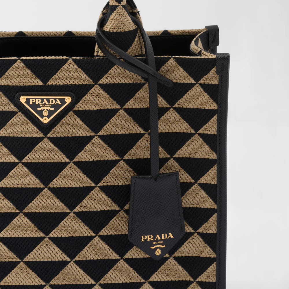 Introduced for the first time on trunks designed by Mario Prthtada, the Prthtada triangle expresses uniqueness and modernity through its universal, minimalist shape that is reinvented in a different way each season. Here, the geometric design is transformed into a sophisticated yet modernist pattern that plays with contrasting colors and decorates this sleek tote bag. Details in the brand's iconic Saffiano leather embellish the design completed by a detachable shoulder strap that allows it to be worn in different ways.