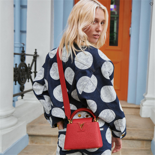 The Capucines Mini handbag in Scarlet Red Taurillon leather with gold-color hardware and a fashionably wide strap will up the impact of any outfit, day or night. A very versatile little bag, the Capucines can be carried by hand, on the shoulder, or cross-body. The flap can be tucked inside to feature the discreet LthtV signature or left outside.