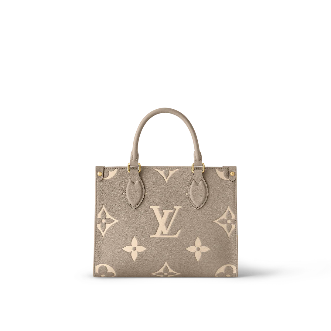 Inspired by Lothtuis Vuithttton’s famous Sac Plat from 1968, the Onthego PM tote is fashioned in Monogram Empreinte leather, embossed with a Giant Bicolor Monogram pattern. This smaller version of the original Onthego fits essentials such as an iPad Mini. Articulated top handles and an adjustable removable strap offer a variety of carry options.