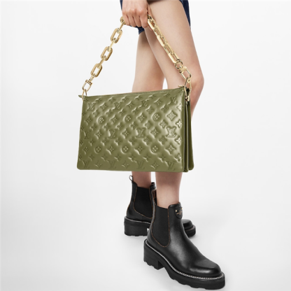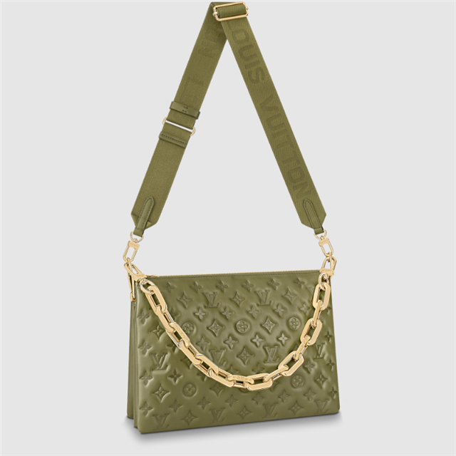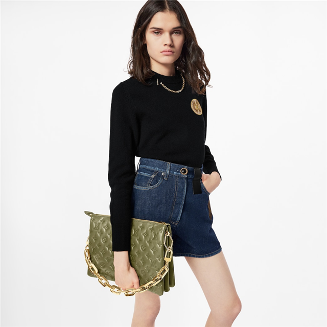 The Coussin MM handbag is fashioned from puffy lambskin, embossed with a Monogram pattern. Voluminous, soft, and supple, the bag almost feels like a pillow. An adjustable textile strap allows shoulder and a cross-body carry, while the new Edge Chain, enables under-arm and baguette carry.