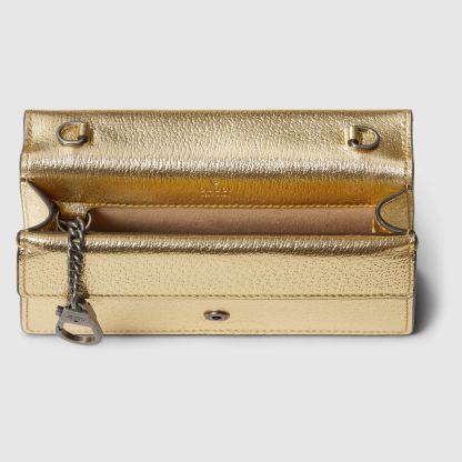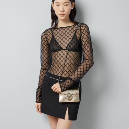 The structured super mini bag is introduced in metallic gold leather, with a key ring that can be used to attach the bag to a separate larger bag. The closure features the textured tiger head spur—the unique detail defines the line, referencing the Greek god Dionysus, who in myth is said to have crossed the river Tigris on a tiger sent to him by Zeus.