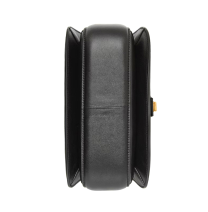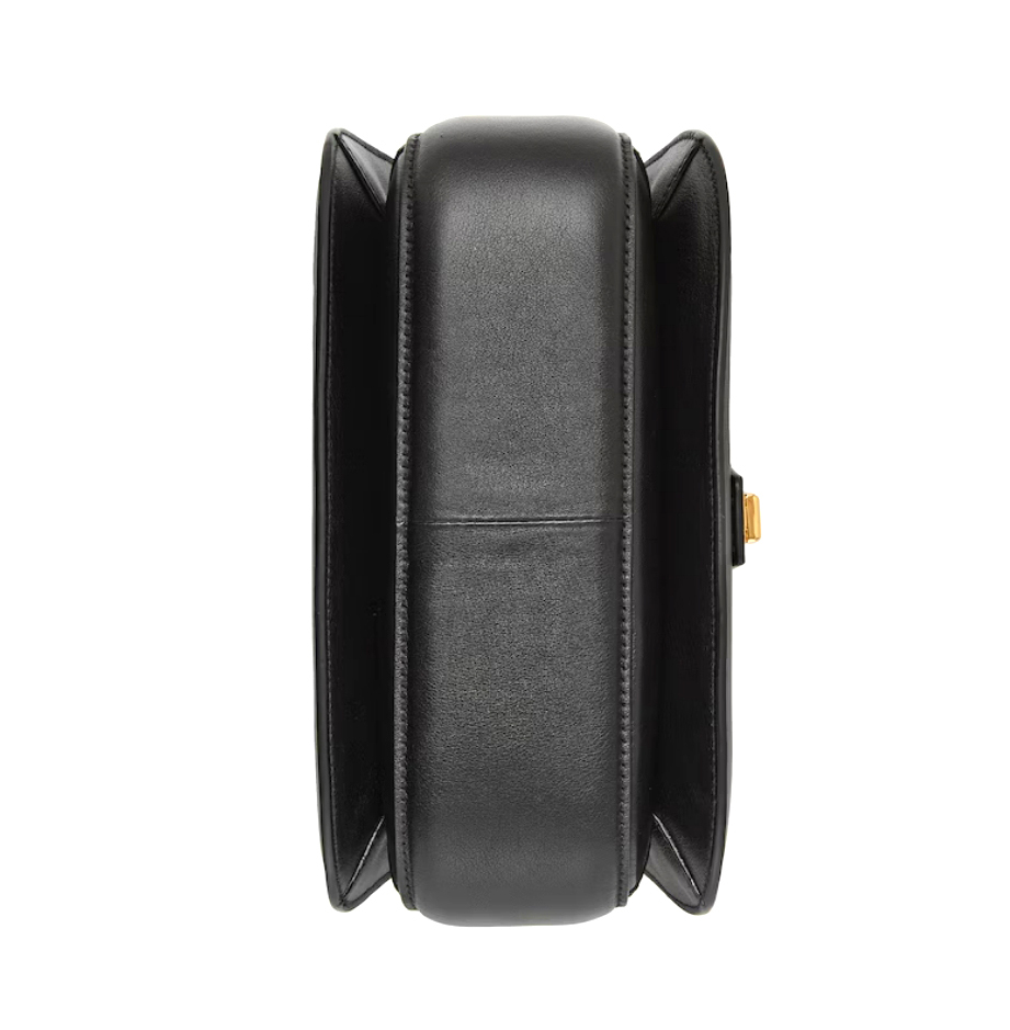 Vintage elements are paired with archival details. This shoulder bag pairs a delicate chain strap with smooth black leather to infuse the accessory with a timeless, yet contemporary feel. The Round Interlocking G, an archival code, sits atop the central buckle closure.
