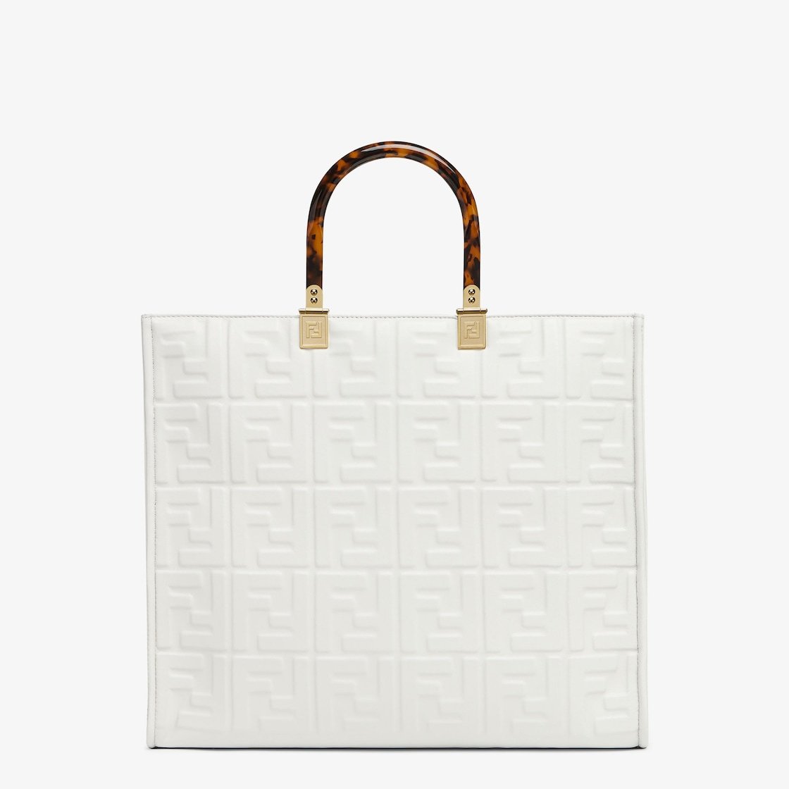 Medium Sunshine Shopper bag made of white leather with raised 3D-texture FF motif and rigid tortoiseshell-effect plexiglass handles.