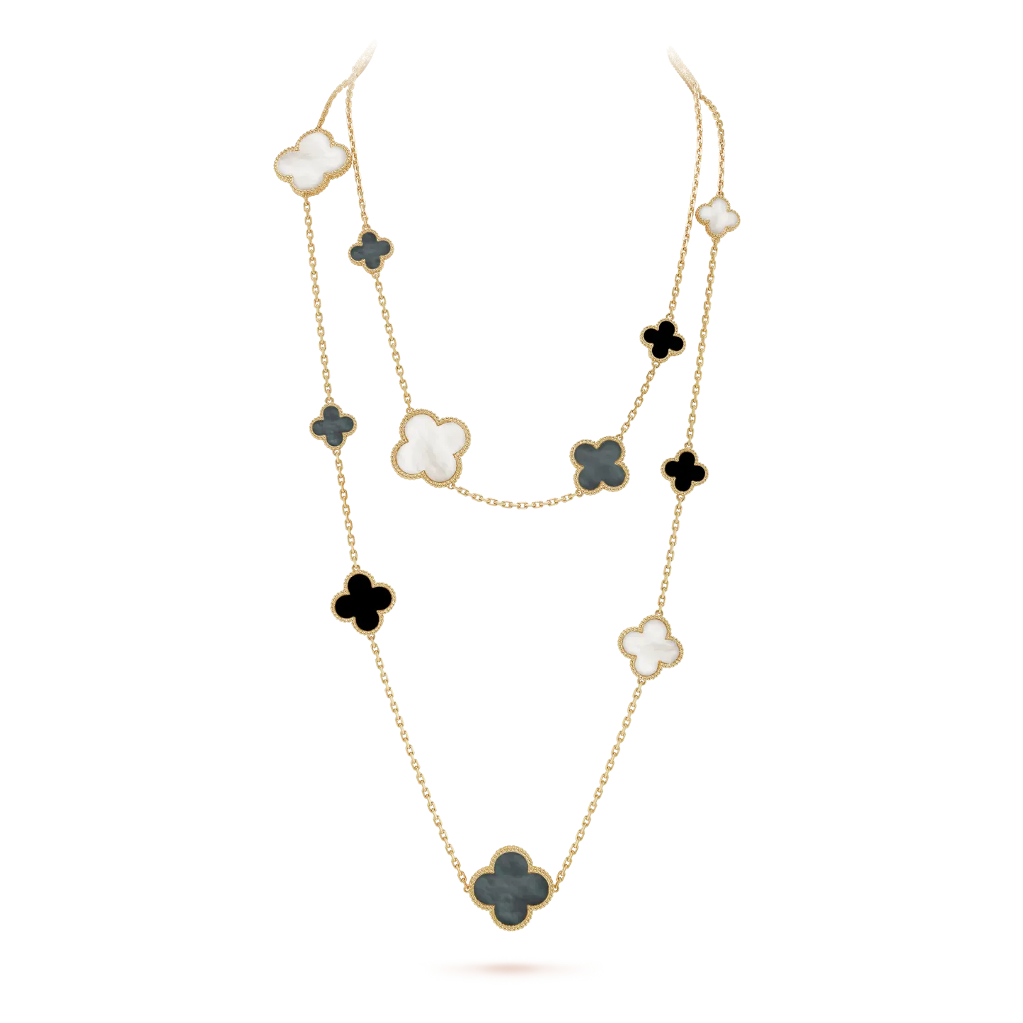 Magic Alhambra long necklace, 16 motifs, 18K yellow gold, white mother-of-pearl.