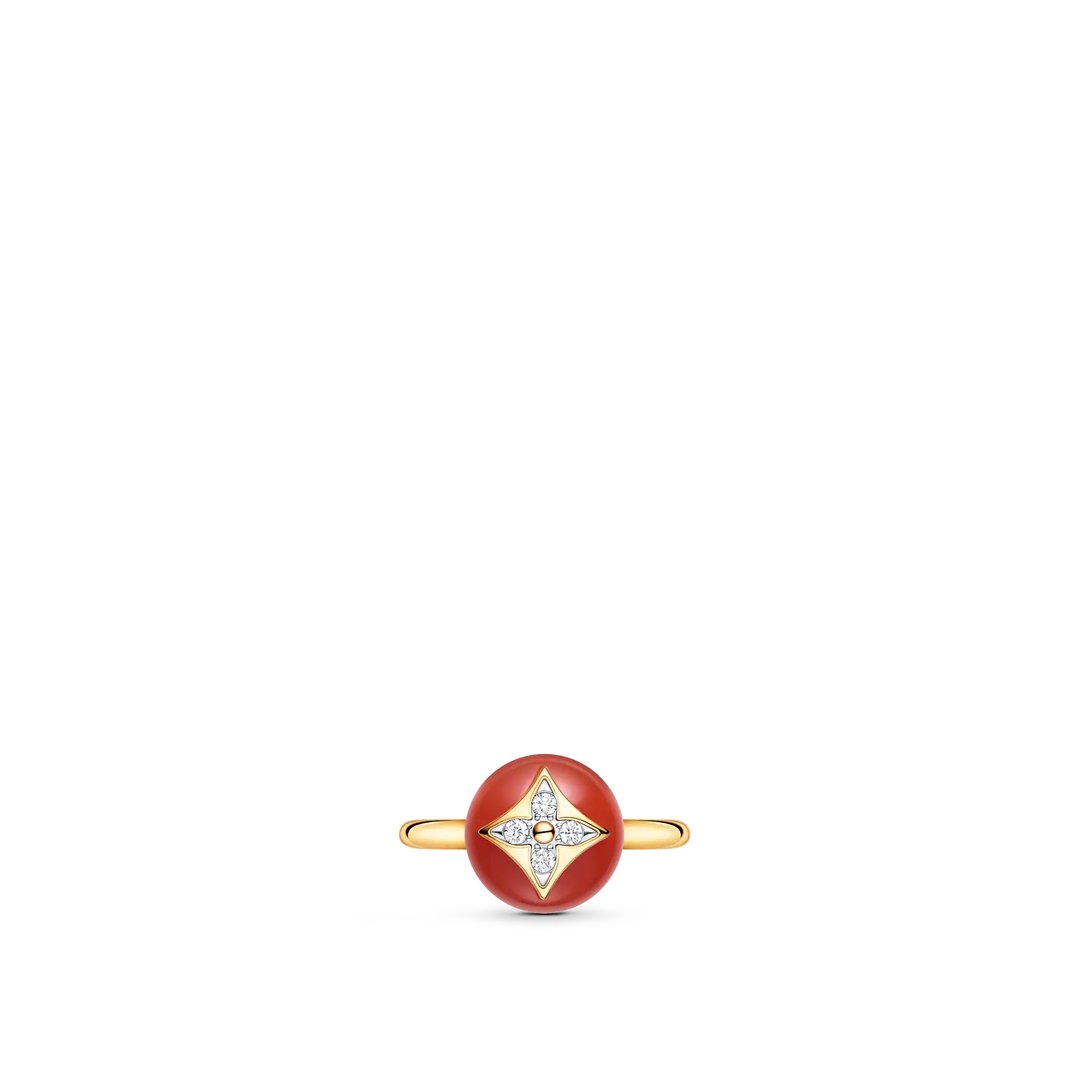 From the B Blossom collection, a suite of bold, modern jewels, comes this 18-karat yellow-gold ring, set with a red-hued cornelian. Inlaid with four diamonds in a Monogram Flower motif, the rounded, polished gemstone recalls a signature stamp. Styled solo or stacked in pairs or threes, it is sure to please a woman who always makes her mark.