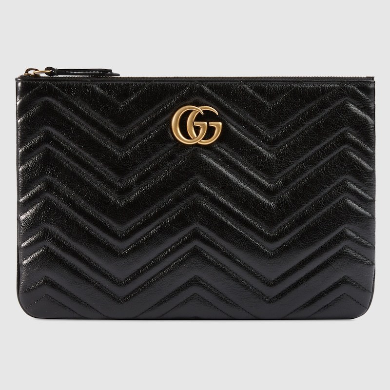 A pouch defined by matelassé chevron leather with a vintage finish. The GthtG Marmont collection is defined by the emblematic Double G hardware—a contemporary take on a Guthtcci archival belt buckle from the '70s that has become a hallmark of the House.