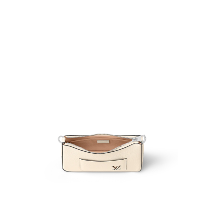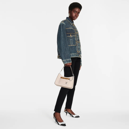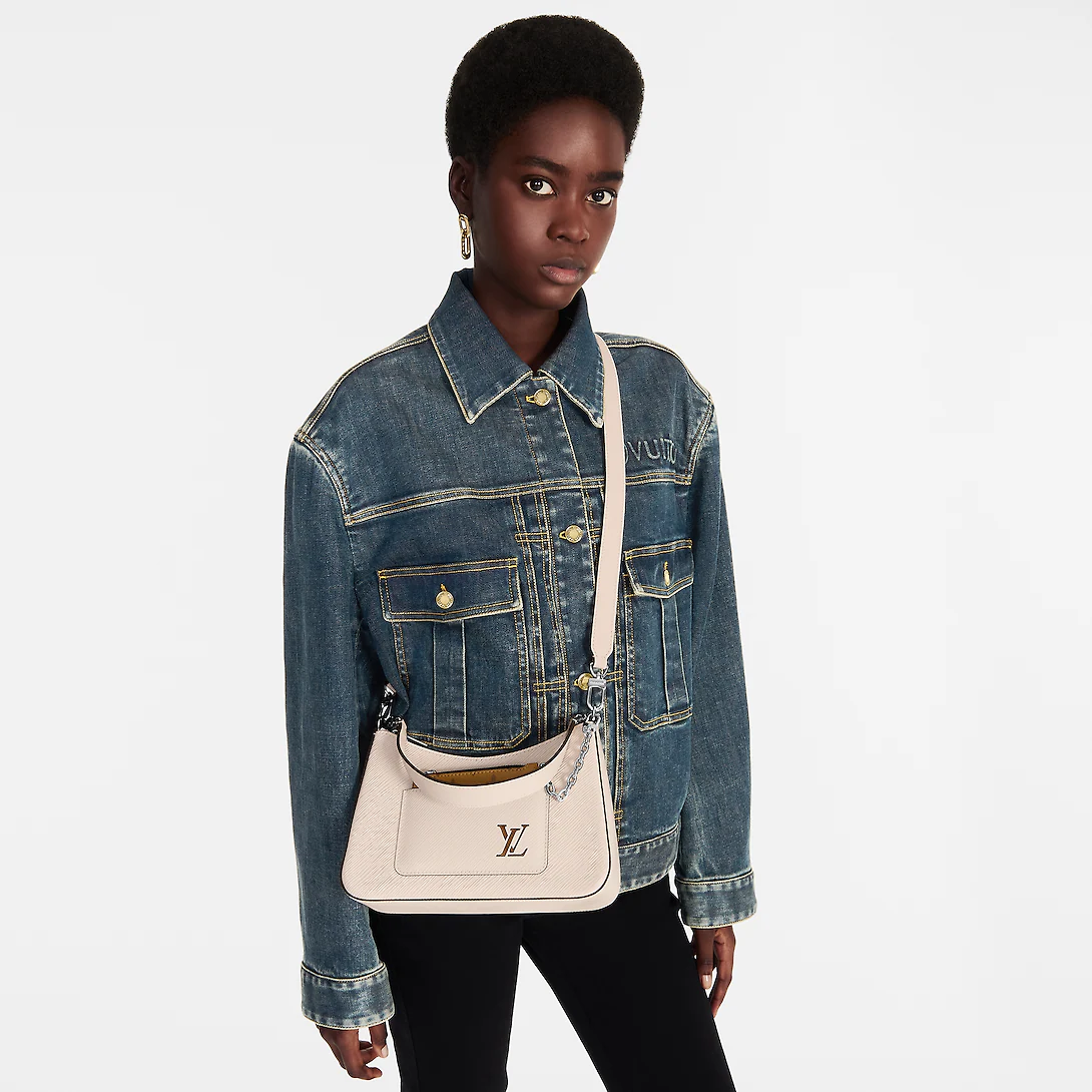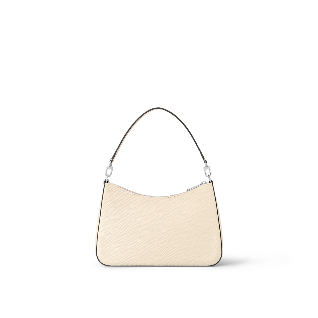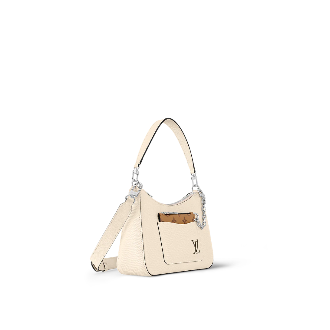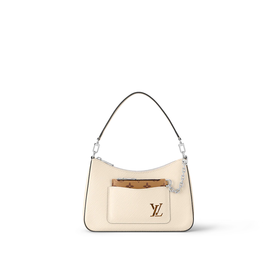 The Marelle handbag is fashioned from grained Epi leather with a detachable canvas pouch that sits in an outside pocket and is attached to the bag with a chain. The Marelle can be carried by hand, elbow or shoulder with its detachable top handle, or worn as a cross-body thanks to its removable and adjustable leather strap.